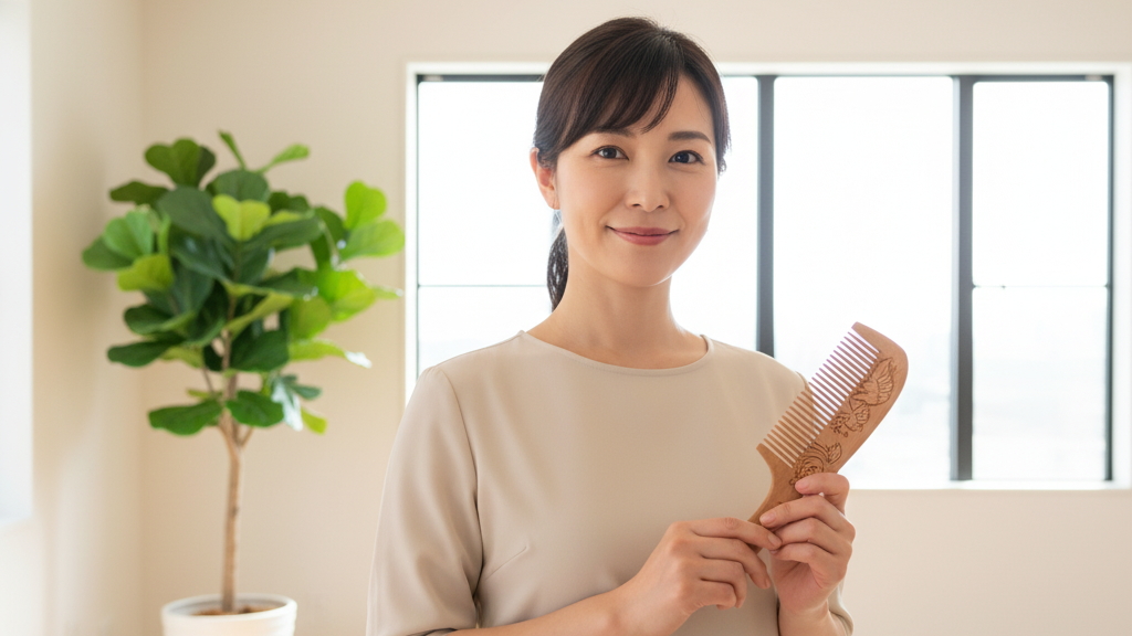 一方で、古くから高級櫛として知られているのが、つげ(黄楊)などの天然木から作られた櫛です。つげ櫛は非常に硬く、使い込むほどに髪の油分が染み込み、美しい飴色に変化していきます。静電気をほとんど起こさず、髪への負担が少ないため、枝毛や切れ毛を防ぐ効果が期待できます。